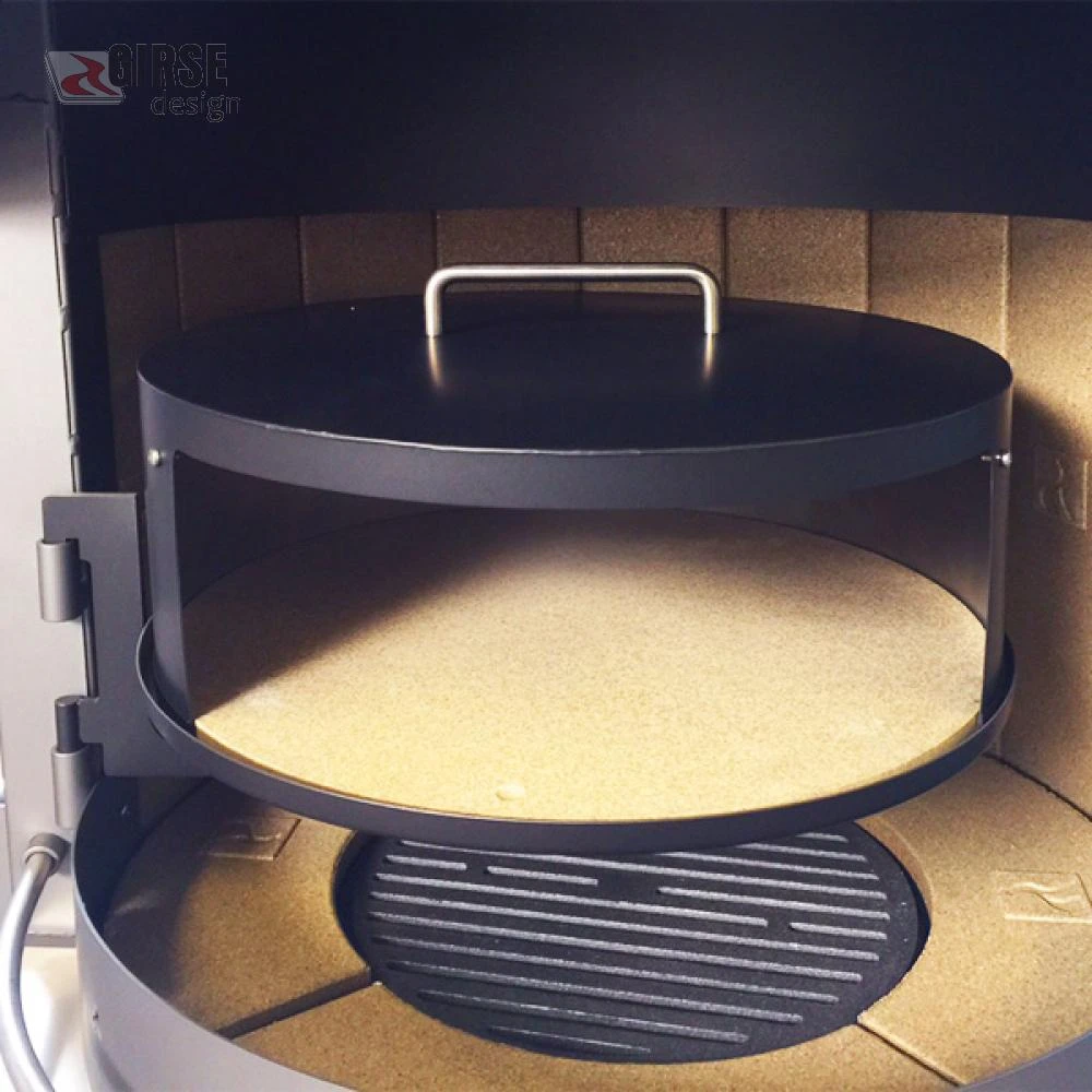 Backen Sie selbstgemachte Pizza direkt in Ihrem Girse Grillkamin! Dafür den Pizzastein einfach an der Halterung Ihres Grillkamins einstecken und ca. 15 Minuten über der Glut vorheizen. Der Deckel sorgt dafür, dass die Hitze über dem Stein, ähnlich wie in einem Umluftofen, gut zirkulieren kann.